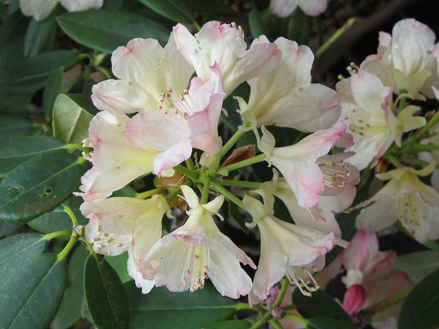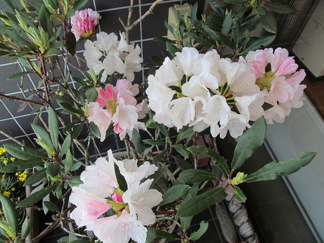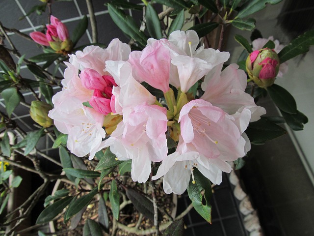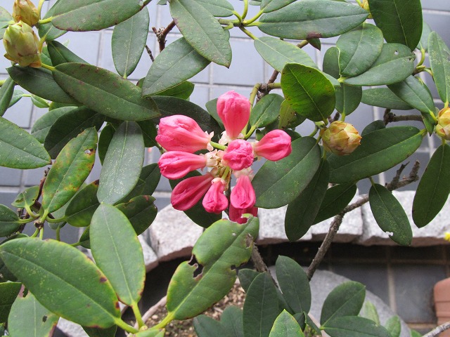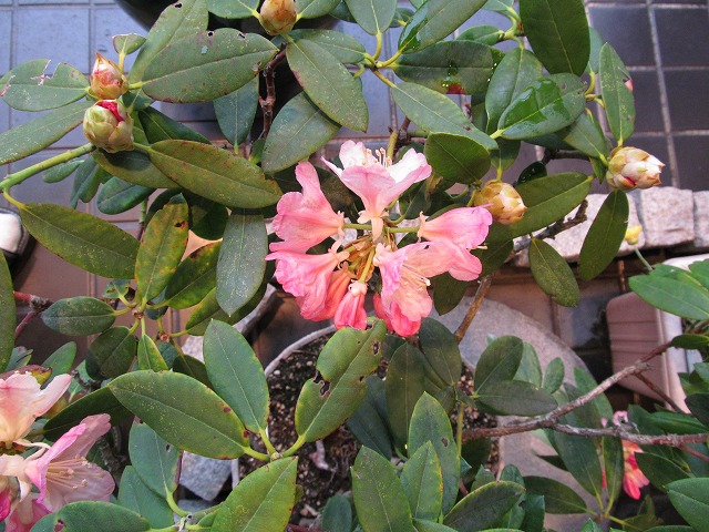 みなさん、こんにちは。5月3日に一輪咲いた、店頭の鉢のシャクナゲが、満開になりました。5月3日から10日目です。一番最初に開いた花も、今日開いた花も、一緒に咲いています。後どの位花を楽しむ…