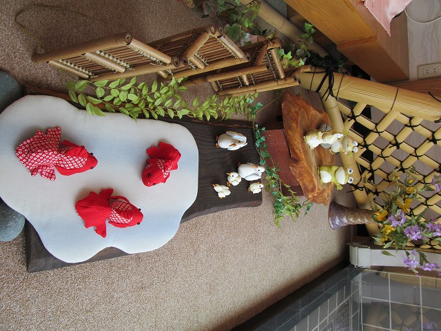 おはようございます。店頭のタイルが敷かれた雨の当たらない場所の模様替えをしました。今までの2種類のシャクナゲと小花の寄せ植えを片付けて、今日から、夏バージョンです。手作りの竹のイカ…