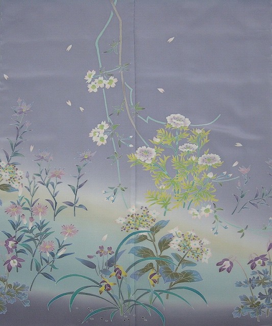 上前の裾から後ろにかけてベージュ、ブルーグリーンのぼかしが花々を引き立てます。