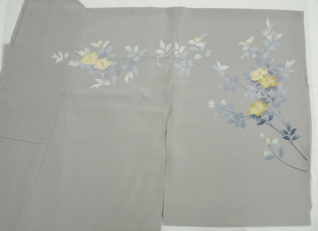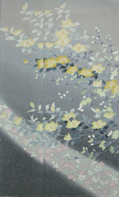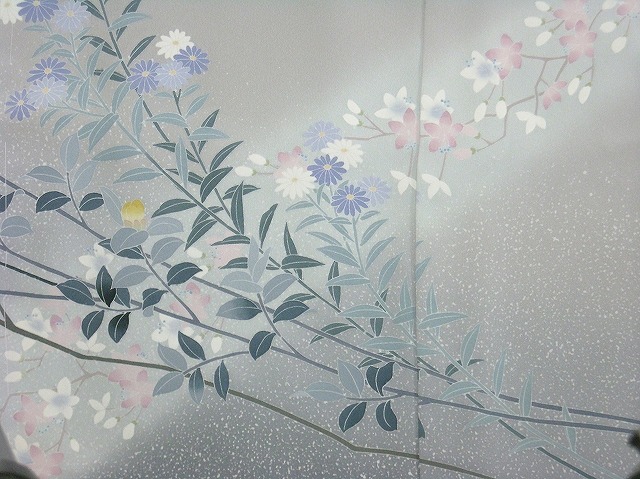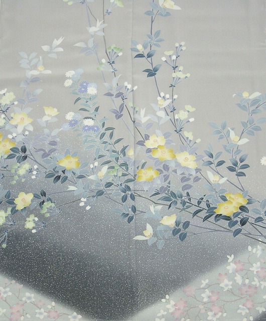 上前の裾から後ろに掛けてと後ろから下前に掛けて斜めに薄いグレーの帯状の上に淡いピンクと白色の小花が描かれています。
