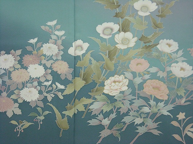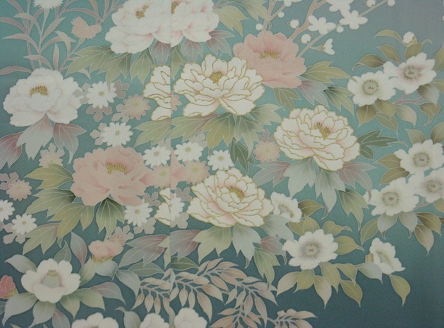 牡丹、菊、藤、なでしこ、南天、椿などの四季の花が色彩を抑えながらも上品に描かれています。
